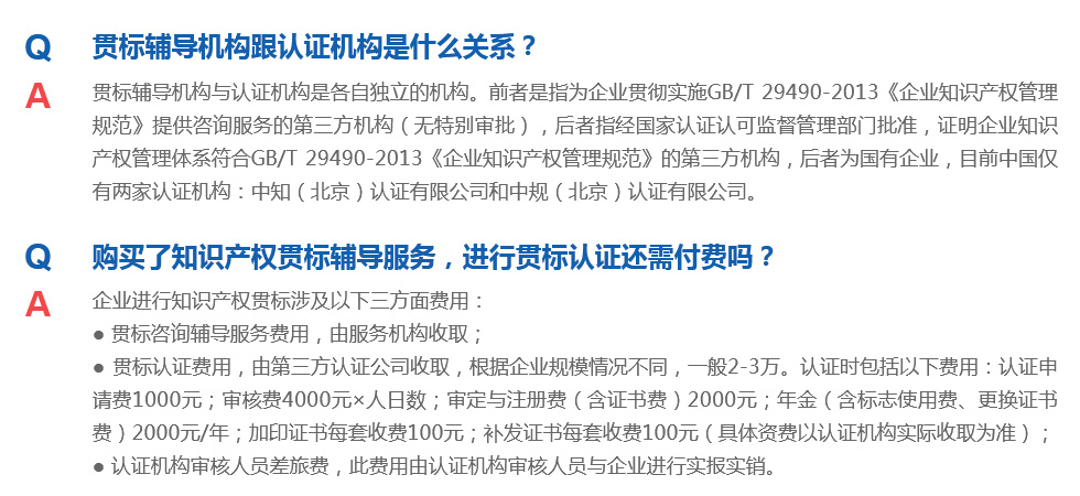 A.貫標(biāo)輔導(dǎo)機(jī)構(gòu)與認(rèn)證機(jī)構(gòu)是各自獨(dú)立的機(jī)構(gòu)。前者是指為企業(yè)貫徹實(shí)施GB/T 29490-2013《企業(yè)知識產(chǎn)權(quán)管理規(guī)范》提供咨詢服務(wù)的第三方機(jī)構(gòu)(無特別審批),后者指指經(jīng)國家認(rèn)證認(rèn)可監(jiān)督管理部門批準(zhǔn),證明企業(yè)知識產(chǎn)權(quán)管理體系符合GB/T 29490-2013《企業(yè)知識產(chǎn)權(quán)管理規(guī)范》的第三方機(jī)構(gòu)。后者一般為國有企業(yè)。目前中國僅有兩家認(rèn)證機(jī)構(gòu):中知(北京)認(rèn)證有限公司和中規(guī)(北京)有限公司。