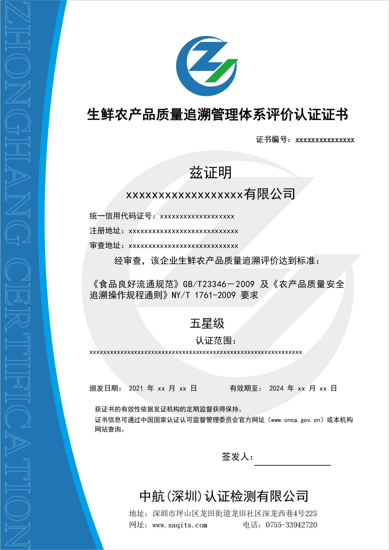 • 生鮮農(nóng)產(chǎn)品質(zhì)量追溯管理體系評價(jià)認(rèn)證證書