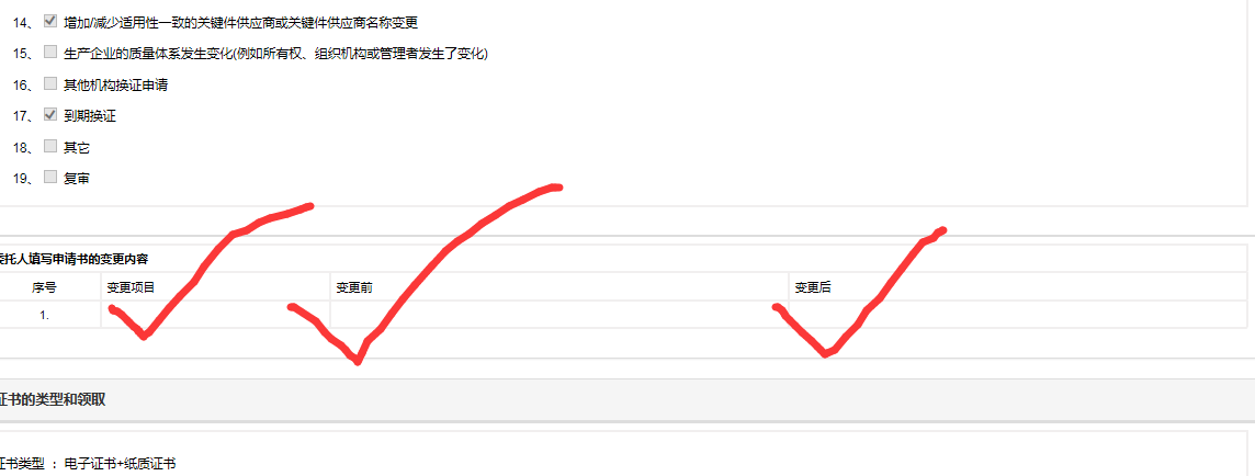 請注明本次申請變更的大致項目,如到期換證書,供應(yīng)商變更等