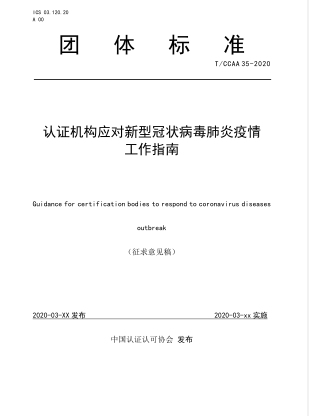 呼之欲出的《認證機構應對新型冠狀病毒肺炎疫情工作指南》的團體標準,即將出來。里面詳細的規定了“疫情防控期間認證機構運行管理和疫情防控期間認證審核的策劃與安排”。詳見以下附件: