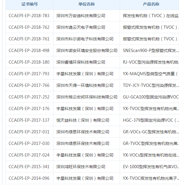 今天東方信諾整理了一下目前VOC在線監(jiān)測系統(tǒng)有多少家通過了CCEP環(huán)保認證,現(xiàn)在系數(shù)一下深圳通過認證的